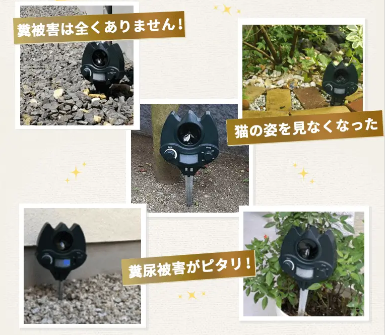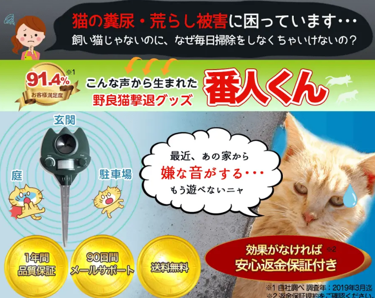 番人くんは超音波を使って猫を撃退してくれるので、動物に危害を加えるわけではないので動物好きな方でも安心して使うことができます。猫などの動物によるフン・おしっこで困っている方は、ぜひ効果てきめんな番人くんを試してみてください。
