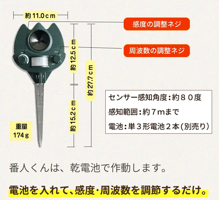 猫よけグッズの番人くんは、猫のフンなどによる被害対策に特化した超音波式の装置です。